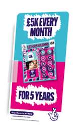 The new ‘Set For 5 Years’ Scratchcard, which costs £2, offers players the chance to win a top prize of £5,000 every month for five years.