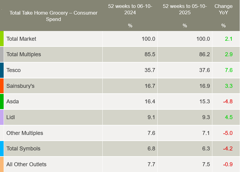 Asda holds a 15.3% value share this period, while Lidl increased its share to 9.3%, up 4.5%, as more customers visited its stores more often, contributing an uplift of £9.3 million.