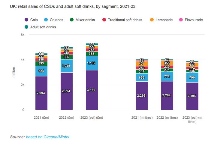 Cola leads CSD retail sales by a long distance, while the leading players’ ongoing marketing and NPD drive engagement. Crushes were the star performer in 2023, bucking the volume decline in CSDs in retail, with high-profile flavoured launches a key driver.