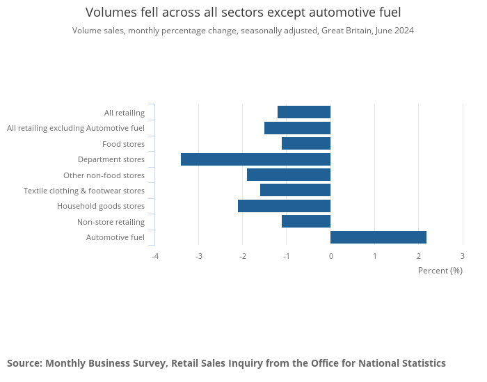 Overall, retail sales volumes (quantity bought) are estimated to have fallen by 1.2% in June, following a rise of 2.9% in May 2024, according to the ONS.