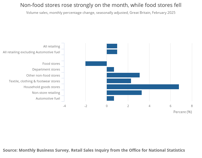 Retail sales volumes are estimated to have risen by 1.0% in February, following a rise of 1.4% in January this year. Non-food store sales volumes grew strongly across the month, with rises in all four sub-sectors (department, other non-food, clothing and household goods stores).