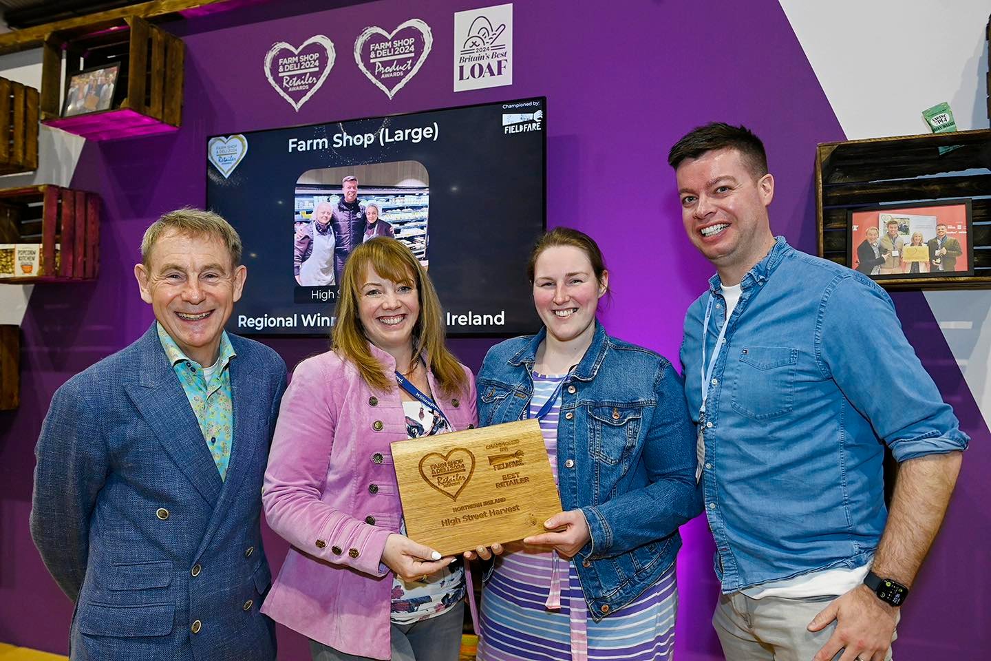 Nigel Barden (chair of judges) and James Cunningham (Cunningham Butchers, Kilkeel) presenting the Retailer of the Year Northern Ireland award at the recent Farm Shop and Deli Show 2024 to Glenda and Rachel