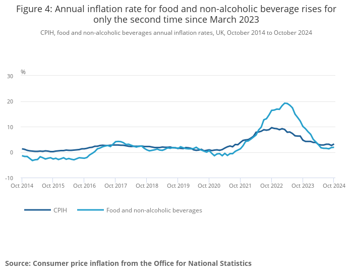 Looking more specifically at food and non-alcoholic beverage prices, these rose by 1.9% in the year to October, up from 1.8% to September 2024. The annual rate of 1.9% is down from a recent high of 19.2% in March 2023.