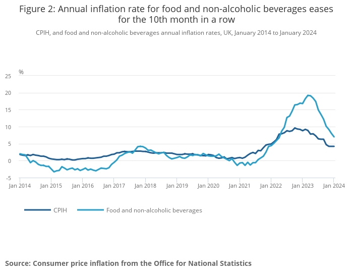 The annual rate of food and non-alcohol beverages has fallen from 8.0% in December 2023 to 7.0% in January 2024, which is the lowest annual rate since April 2022. The fall to 7.0% means the annual rate has eased for the 10th consecutive month, from a recent high of 19.2% in March 2023, which was the highest annual rate seen for over 45 years.