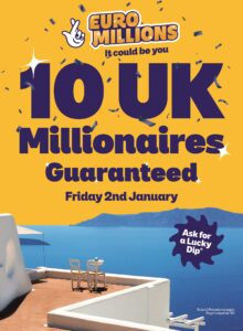 The celebrations continue into the New Year with the EuroMillions 10 UK Millionaires draw on 2nd January, backed by in-store POS from 25th December. Retailers could see a 145%** uplift in EuroMillions sales and are encouraged to keep playslips topped up and Scratchcard dispensers full to maximise sales opportunities.