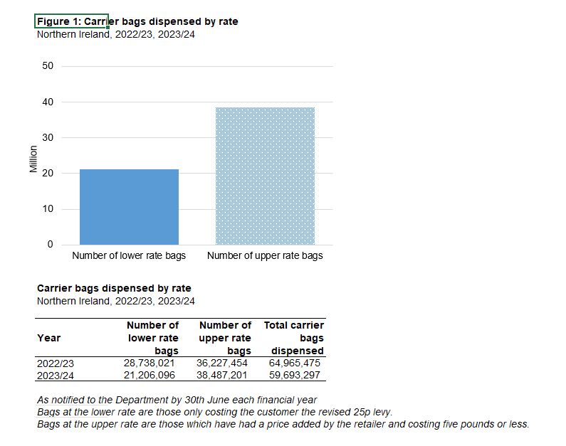 In their breakdown of figures, DAERA revealed that the number of lower rate bags dispensed in 2023-2024 (costing only the 25 pence) was 21.2 million, 26.2% lower than 2022-2023. The number of upper rate bags dispensed (those costing more than the 25 pence levy and up to £5) was 38.5 million, 6.2% higher than 2022-2023.