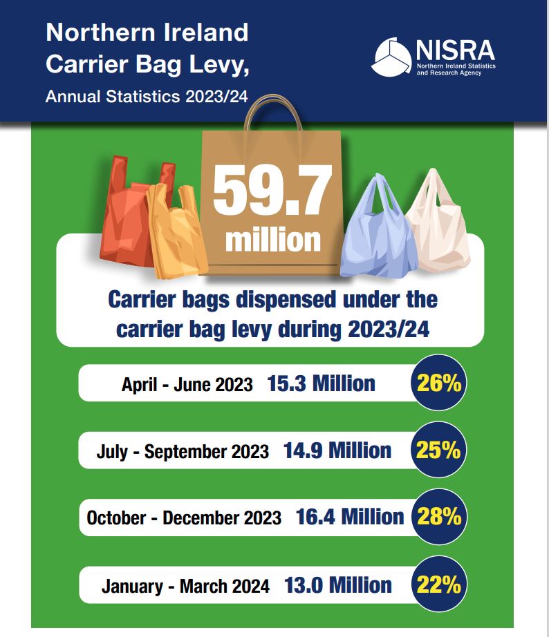 The figures relate to the number of carrier bags dispensed by 2,347 Northern Ireland retailers (not the number of actual premises) between 1st April 2023 and 31st March 2024, as notified to the Department by 30th June 2024.