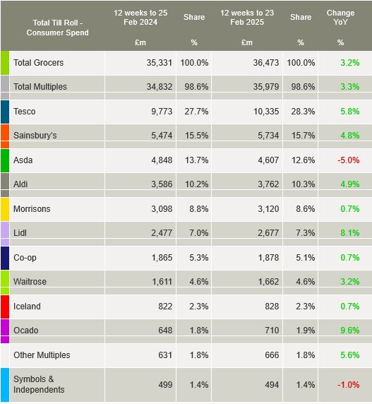 Turning to the discounters, Lidl has seen its portion of the market rise by 0.3 percentage points to 7.3% compared with February 2024, with sales up by 8.1%.