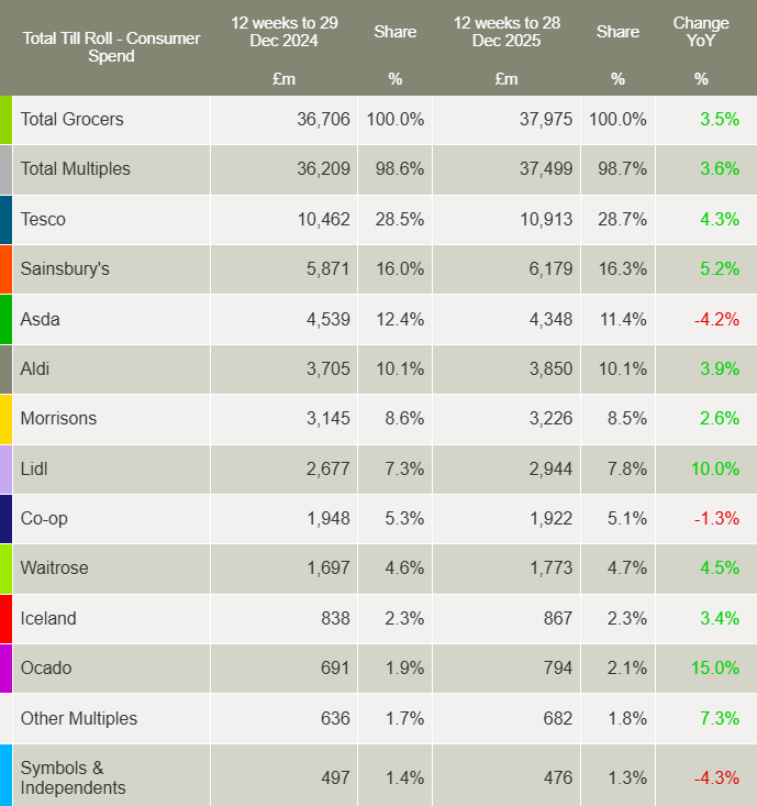 Meanwhile, Tesco sales were higher than in 2024, with its share rising by 0.2 percentage points to 28.7%, the greatest proportion of the market since March 2015. Lidl made the greatest gain in market share among the supermarkets, adding 0.5 percentage points to claim 7.8% of the market – a record for the discounter over the festive period.