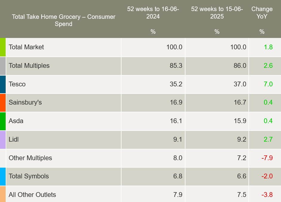 The warm June weather encouraged consumers out and about, resulting in a 1.8% increase in grocery spend compared to last year.